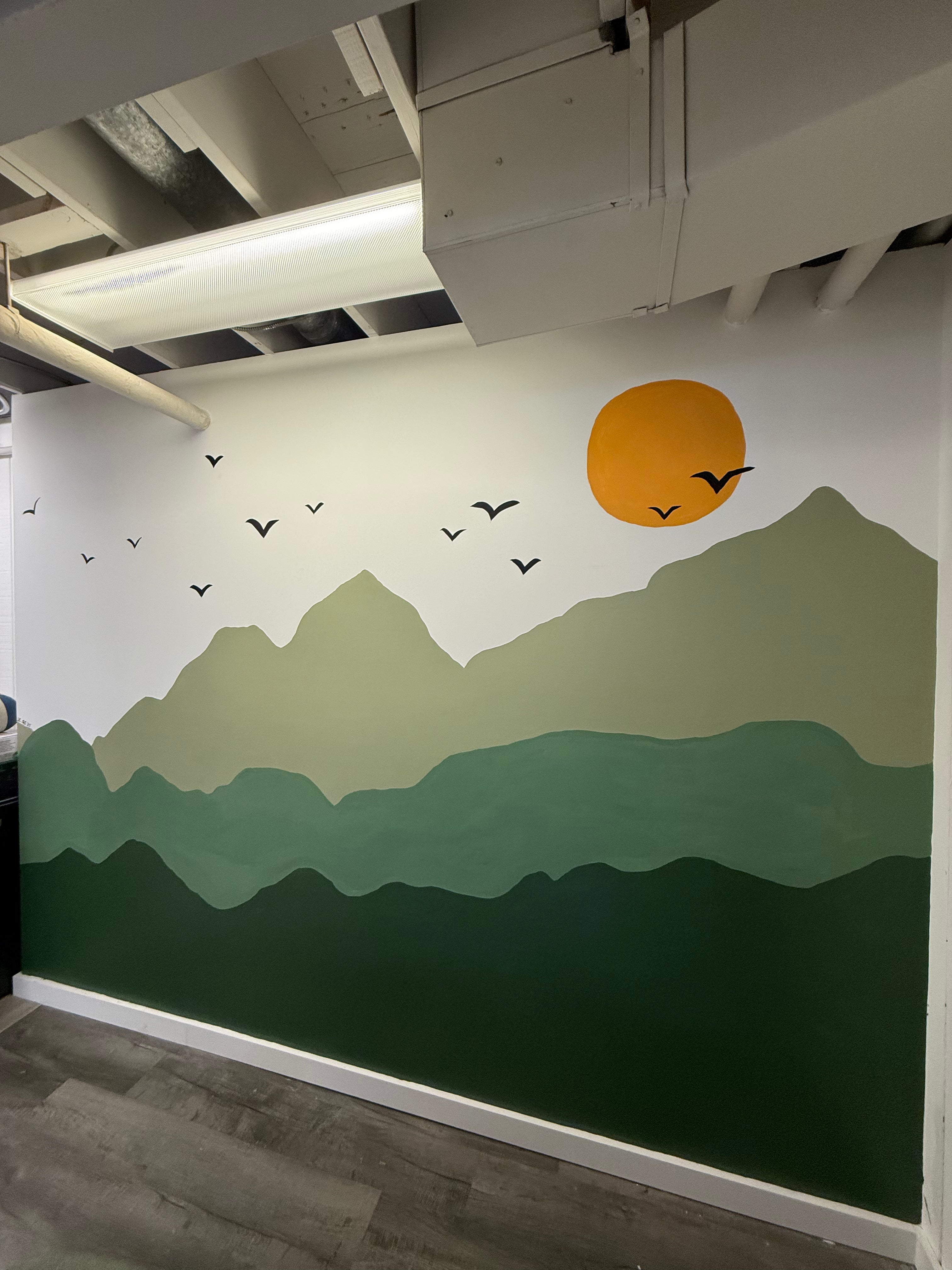 Created in a therapeutic space for adolescents, this mountain mural adds a calming and grounding atmosphere to the room. Its serene landscape encourages reflection, resilience, and a sense of stability, which are key elements in the healing process.