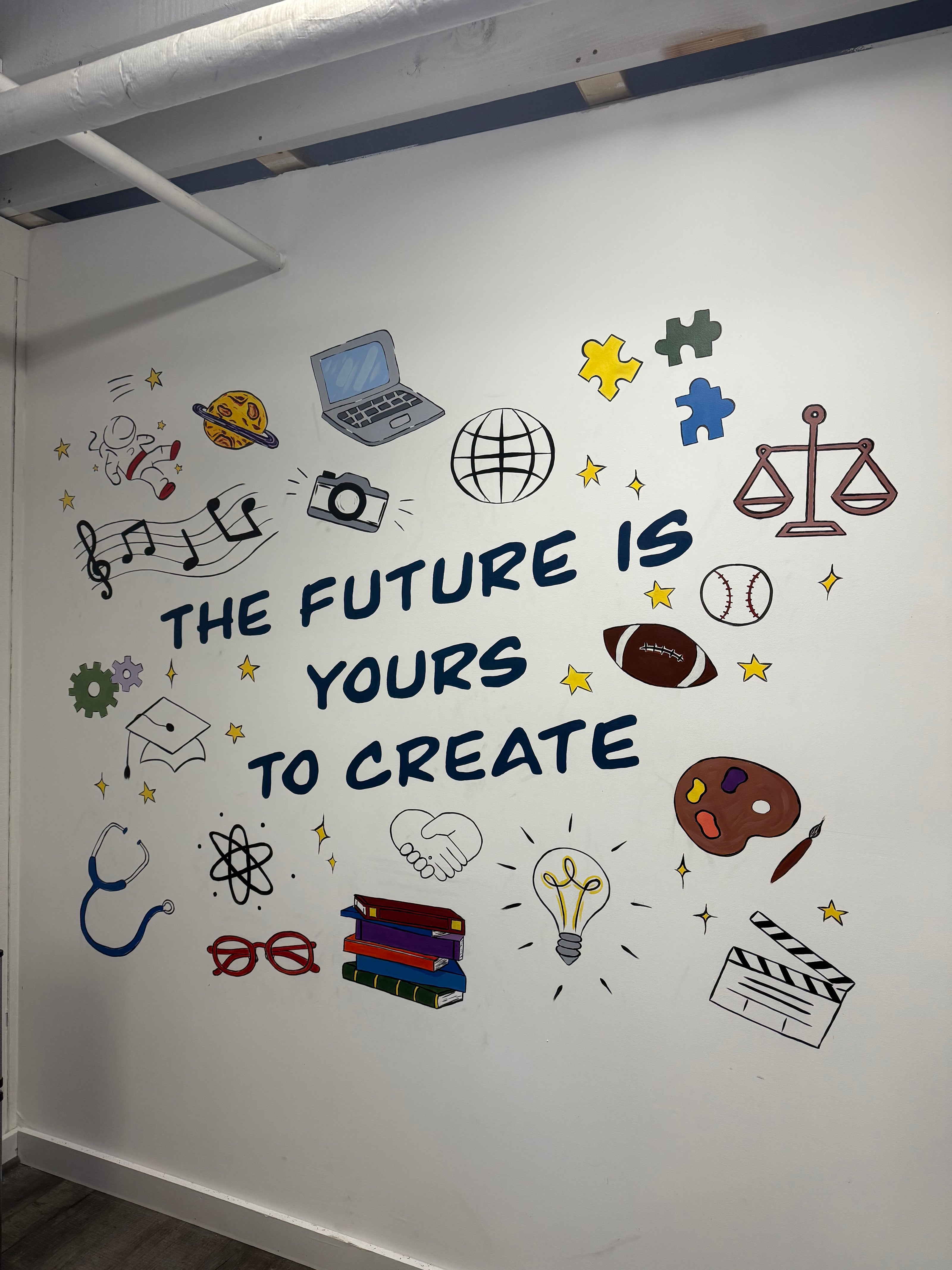 This mural was created in a classroom serving a culturally diverse population of at-risk adolescents in the community. The purpose: To inspire and empower youth to believe in their potential for a successful future.