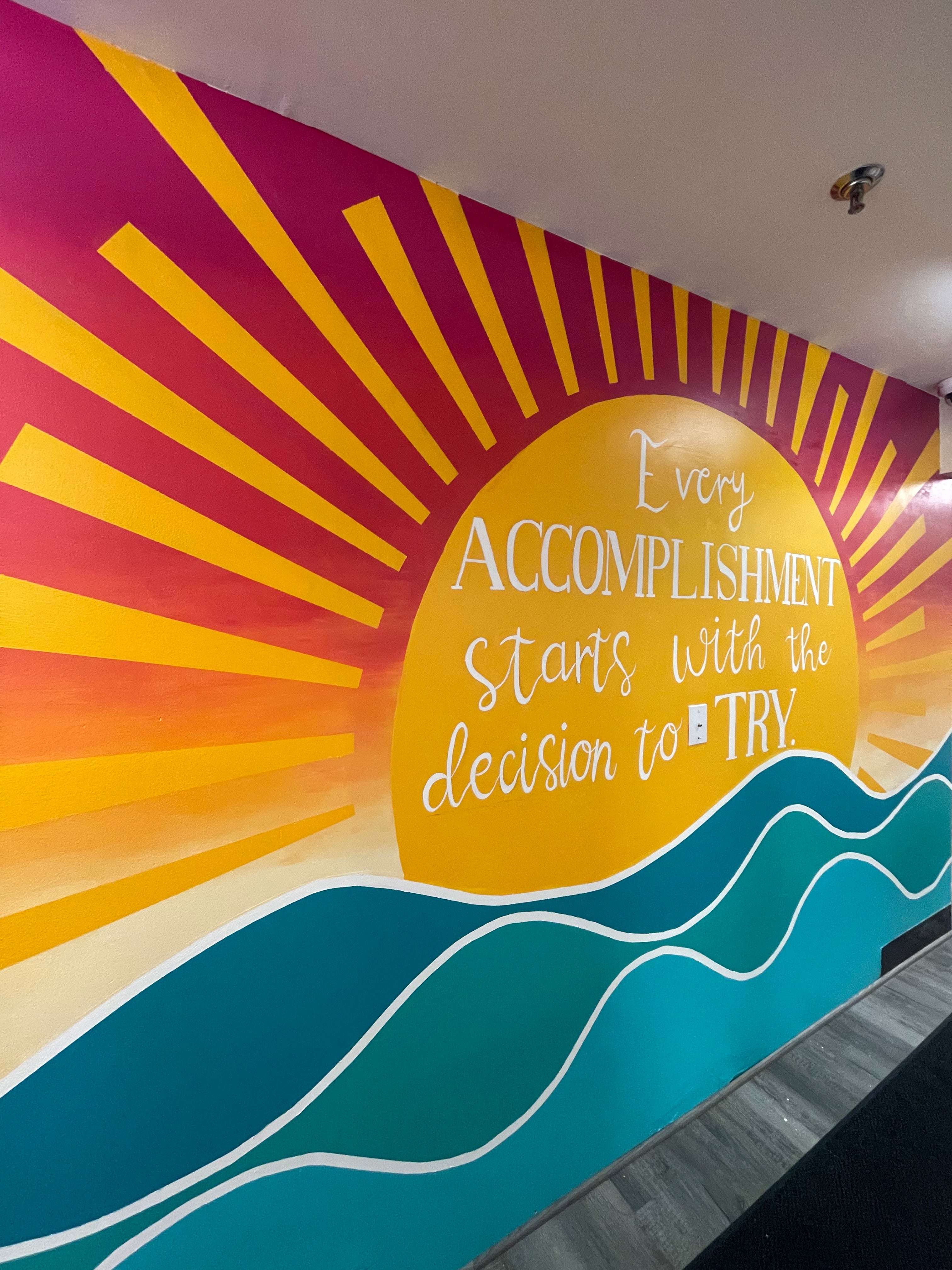 This sun mural was created in a group home for the at-risk youth population in the community, encouraging them to believe in themselves and take the first steps toward positive change. The mural reads, "Every accomplishment starts with the decision to try," serving as a daily reminder of their potential and the power of perseverance.