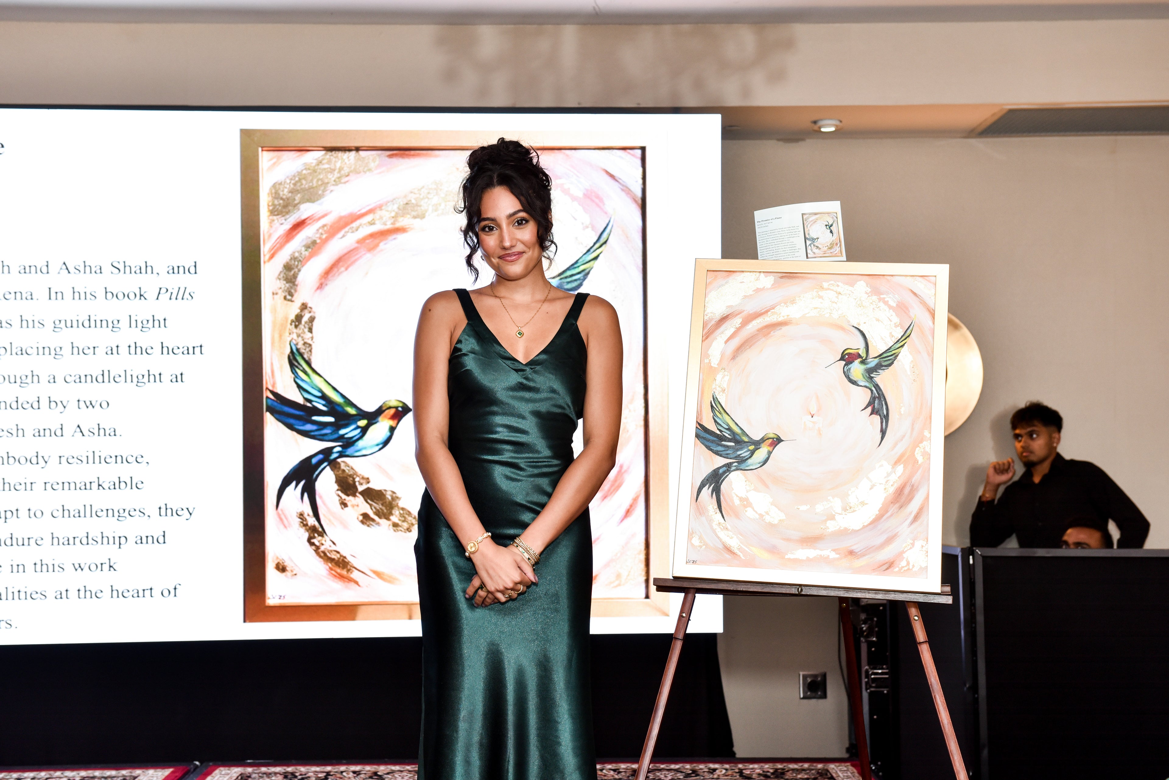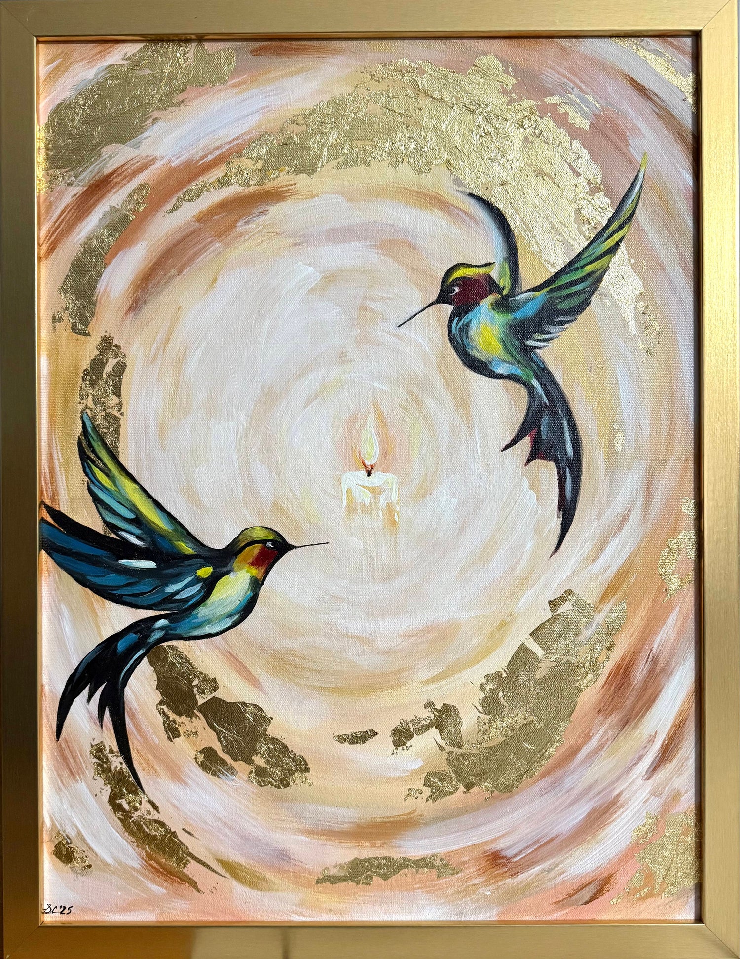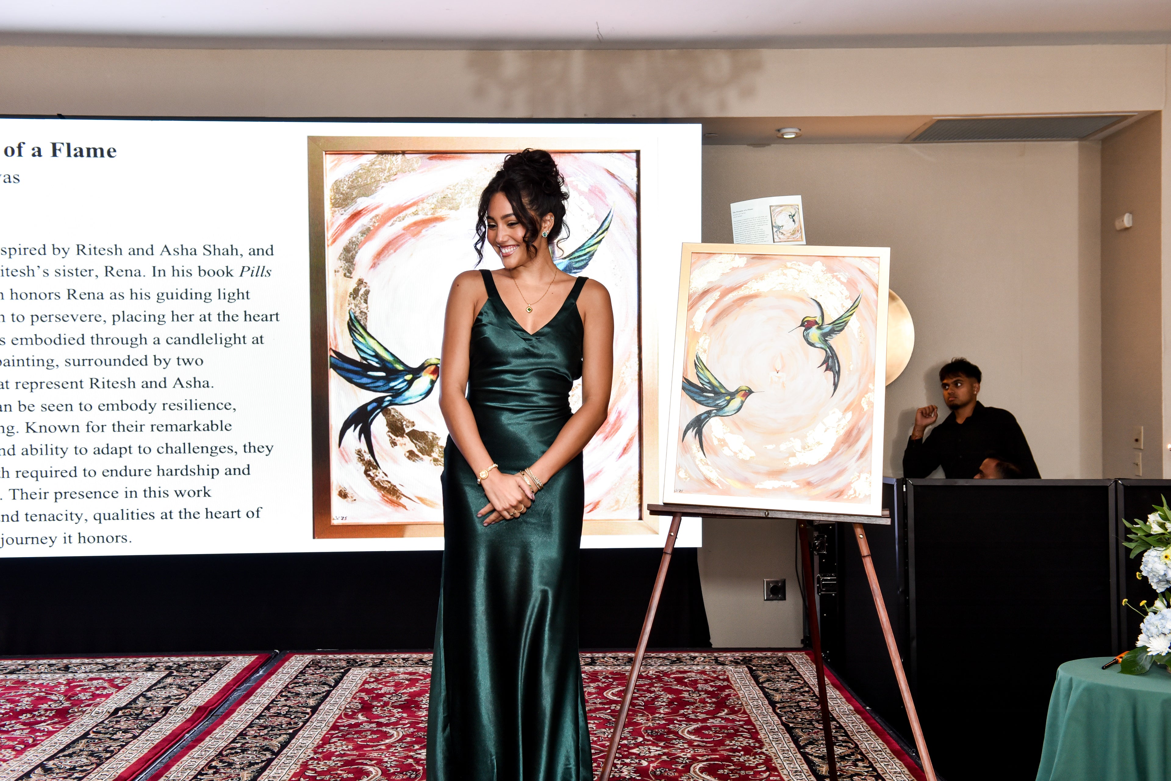 This painting is inspired by Ritesh and Asha Shah, and pays homage to Ritesh’s sister, Rena. In his book Pills to Purpose, Ritesh honors Rena as his guiding light and his motivation to persevere, placing her at the heart of his story. She is embodied through a candlelight at the center of the painting, surrounded by two hummingbirds that represent Ritesh and Asha. Hummingbirds can be seen to embody resilience, beauty, and healing. Known for their remarkable agility, control, and ability to adapt to challenges, they reflect the strength required to endure hardship and continue forward. Their presence in this work represents hope and tenacity, qualities at the heart of the book and the journey it honors.