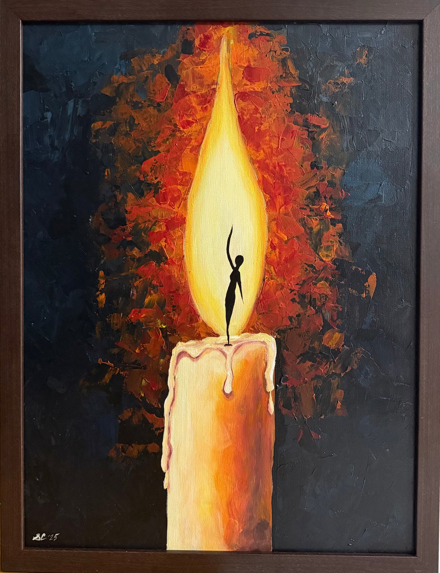 This painting depicts an ethereal candle flame with a human figure as the wick, symbolizing the inner light that inspires transformation. Just as medicine provides healing for the body, this light embodies the healing of spirit and purpose. The imagery reflects a purpose of Ritesh’s charitable pharmacy- to not only provide life-saving medications, but also to inspire compassion, hope, and connection. It is through these values that we spark and sustain the inner light that connects us to one another. This painting honors the transformation from pills to purpose, illuminating how healing can extend beyond the counter and into the heart of community.